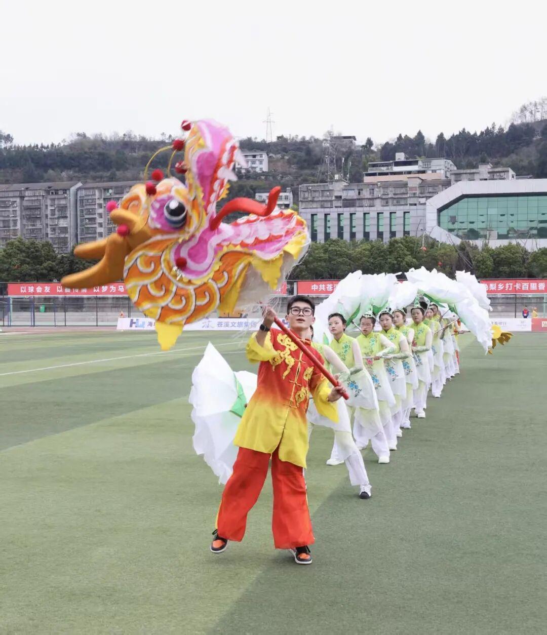 中场休息时,来自苍溪县多所中小学校的276名孩子,送上了精彩的足球主题啦啦操表演。狮舞队用欢快的表演将元宵佳节的气氛烘托至高潮,歌手与演职人员则用《天下相亲与相爱》的歌声,向现场的4000余名球迷送上了节日的祝福。